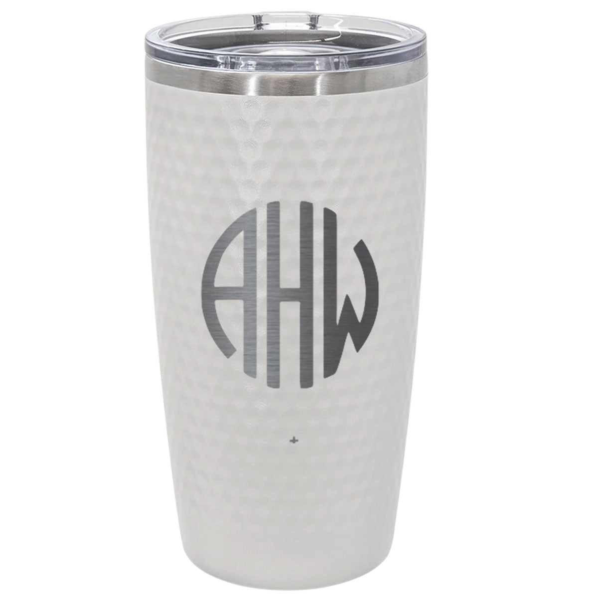 This custom 20oz golf tumbler features a bold circle monogram design, engraved with up to 3 initials of your choice. It's the perfect blend of modern style and golf-inspired texture — an excellent gift for players, coaches, or anyone who appreciates personalized drinkware.