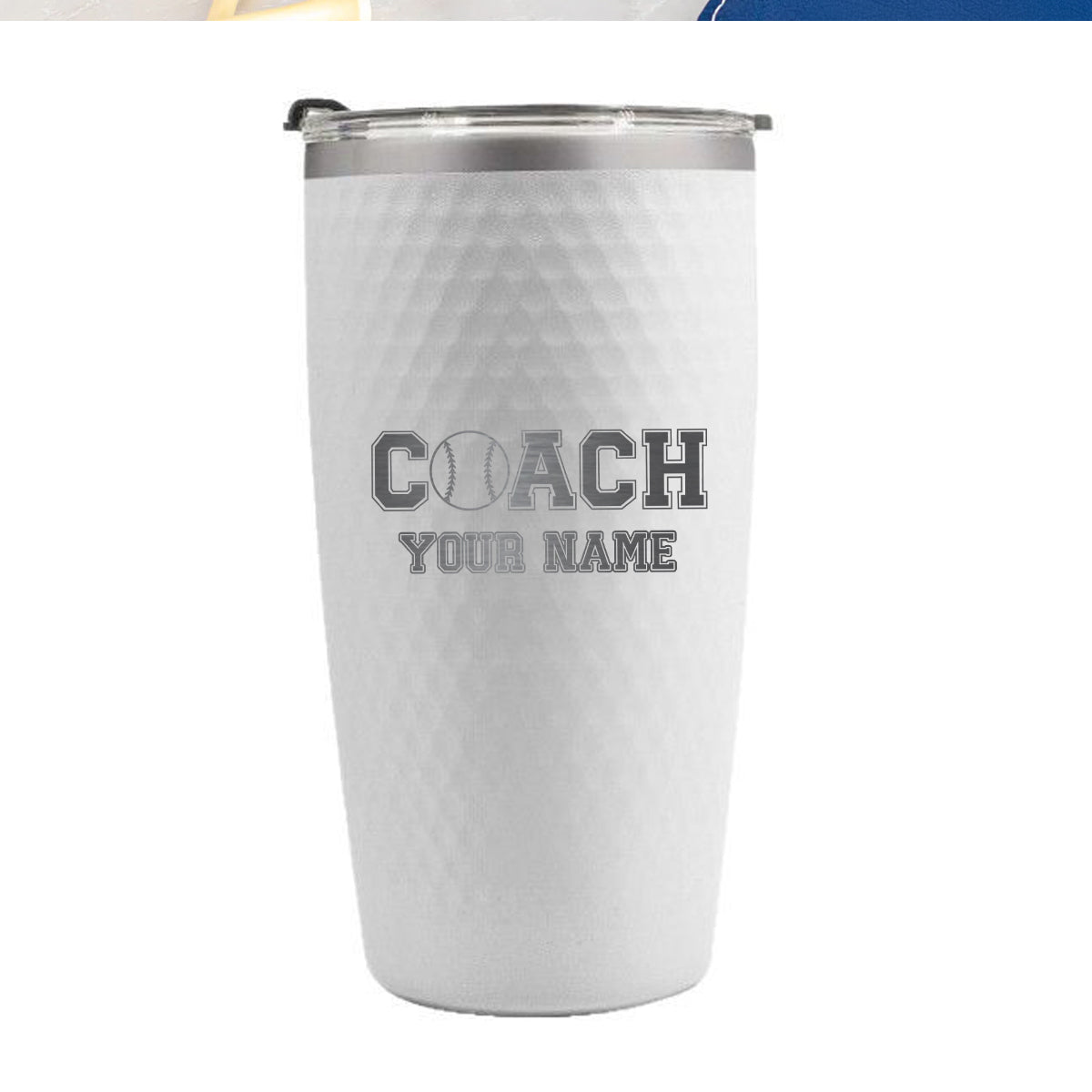 Made from durable 20oz stainless steel with double-wall vacuum insulation, this engraved baseball coach tumbler keeps drinks cold or hot for hours. The word “COACH” is etched in all caps, with a baseball replacing the letter “O,” and your coach’s name or team name engraved below.